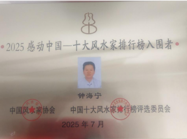 2020年8月28日在中国世纪大采风二十周年庆典暨电视人物颁奖盛典:授予:中国当代杰出风水大师荣誉称号!2022年10月20日人民代表报形象展示四分之一版“以德济世、以易结缘”一记优秀国学文化传承人钟海宁刊登。