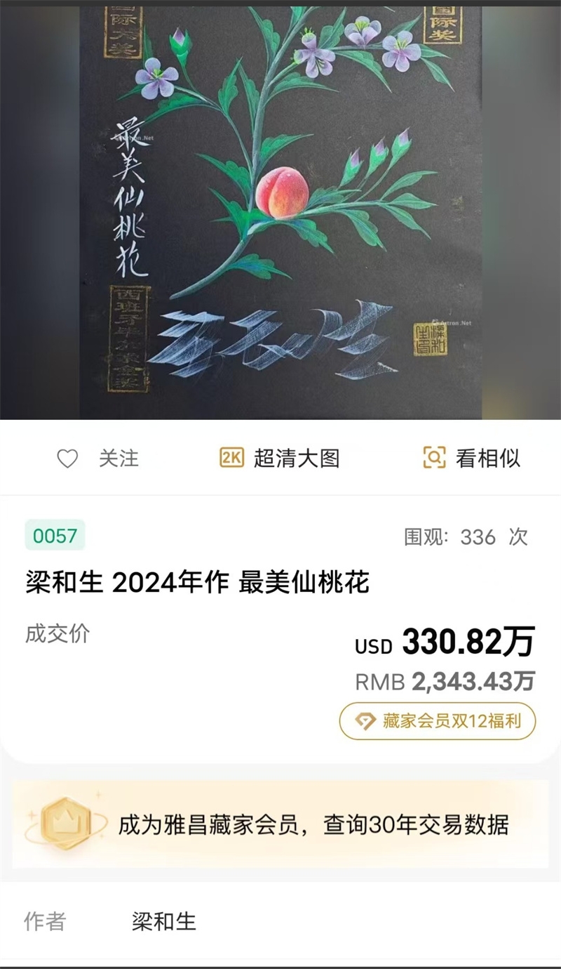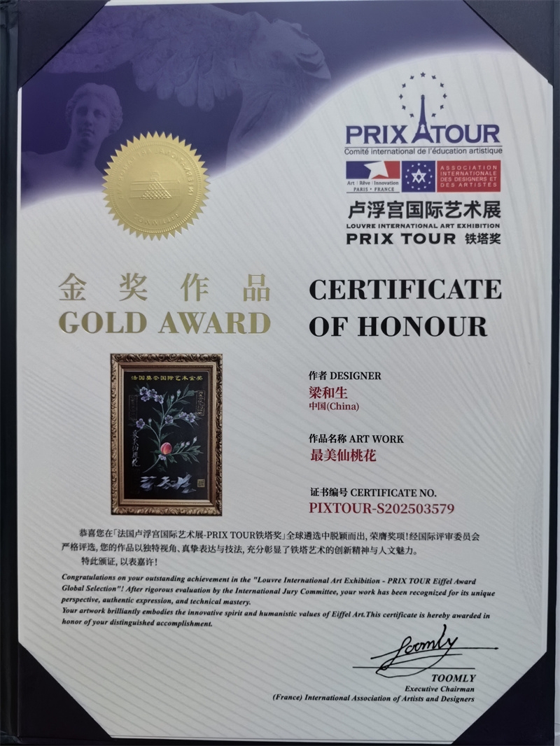 卢浮宫铁塔奖(PRIX TOUR)是法国卢浮宫国际艺术展(IAP)设立的艺术奖项,以闻名的巴黎铁塔冠名,有很高的威望。该奖项由法国国际艺术家与设计师协会(IAP)主办,吸引了中国大陆、中国香港、中国澳门、中国台湾及越南、新加坡、美国、法国等全球顶尖艺术大咖争夺金、银奖。梁和生此次参展的是高清绘画“最美仙桃花”,这种高清绘画除冷军以外,其它没人能画的出来!而且此画在美国有过三百多万美金的拍卖纪录,折合人民币二千多万元!