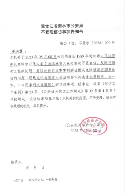 牡丹江市中院怕露丑,稳匿监审卷。海林市委出面都沒查到。却查到牡丹江市中院档案室案号在,内容却被调了包?!追查了三十多年,今年最高人民法院院长张军同志收到潘洪君特快专递,层层转办,终审法院再次支找牡丹江市中院,仍然没有合理的答复!!!