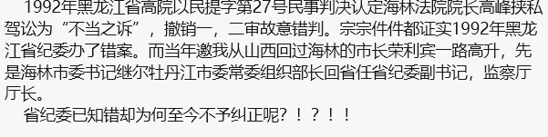 根据《民诉法》笫四十九条规定,民事当事人有权阅卷与复制。黑龙江省海林市(县)原政协党外副主席潘洪君遭遇市委委员法院长高峰挟私驾讼,套取伪证故意错判,经各级政协关注,两高指令黑龙江省高院调卷提审,撤销了牡丹江市中院与海林市(县)法院故意错判。奇怪地事情是:当年黑龙江省政协法制办主任任永达同志陪同全国政协法制视察团赴牡丹江市视察,向按待的市委副书记,常务副市长(后升任省委统战部长,省政协副主席)曹广亮同志反映此案,促成牡丹江市中院进入监审程序。当庭被一审法院院长挟私驾讼的原告崔秀祥曝出三个“雷儿”:一,1997年崔做为法人的工程队包工不料为潘建房,时任工商局长的高峰以介绍水产公司工程为诱饵,让他施工中使坏。造成了质量事故,撂下不干,跑水产施工去了;二,事过两年,高峰升任海林县(1990年撤县建市)法院院长,又让崔到法院民事起诉,免交诉讼费,还打了保票包赢;三,一审法官出示以崔秀祥与工友小刘,王瓦匠,张瓦匠,马木匠署名写给检察院的《举报信》转到法院民庭做证。崔说他并不知情。