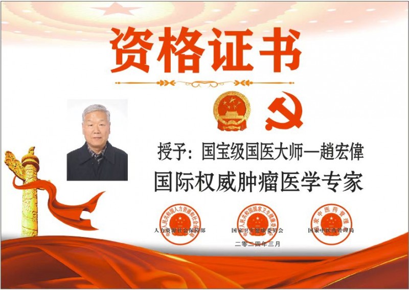 趙宏偉先生,主任医師,国医大师。中华特技名医,中国当代名医、中国当代名中医。国宝级国医大师,国际权威肿瘤医学专家。国际注册特色诊疗执业医师。中华医学国际发展联合会.中华名医理事会副会长。全国中医学术传承委员会“大国名医”第二届理事会荣誉会长,终身医学教授。世界中医药协会专业委员会,中国医学名家数据库中医博士,常务副会长。中国名医专家委员会常务副会长。国务院九部委.全国高健委名医专家委员会主任委员,中国特效医术专业委员会主任委员,北京国际医学科学研究院客座教授。世界卫生组织传统医学科学院首席院士。世界非物质文化遗产研究院特邀院士。俄罗斯下诺夫哥罗德城市神经中心中医专家,俄罗斯.莫斯科MEDGOEN医学医院教授,俄罗斯总统办.国家宾馆医疗中心中医顾问。中国第一健康报道“健康宣传大使”,世界医药卫生理事会医学专家。第二届中国名医大会特邀嘉宾,第二届中国科学家论坛大会特邀嘉宾,第四届中国科学家、经济学家年会特邀嘉宾。