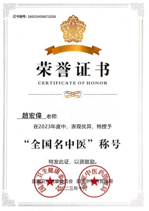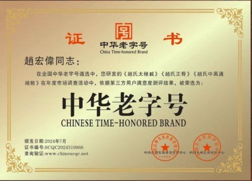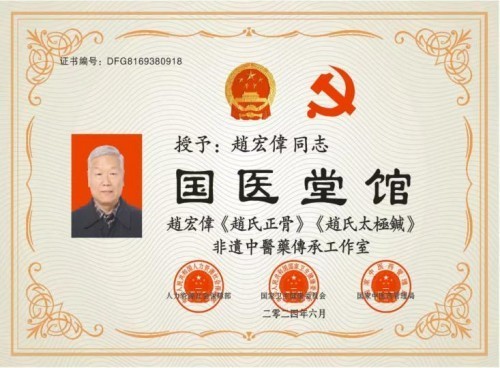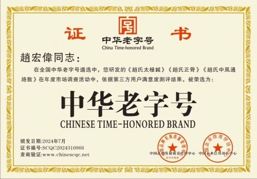2024.6.国家人力资源社会保障部,国家卫生健康委员会,国家中医药管理局授予“趙宏偉《趙氏正骨》《趙氏太極鍼》非遺中醫藥傳承工作室”。2024.7.中国品牌发展质量管理中心,中国企业信用评估中心,向趙宏偉同志頒發了《趙氏太極鍼》 《趙氏正骨》 《趙氏中風通絡散》中华老字号牌匾和证书。(证书編号:SCQC2024310966)