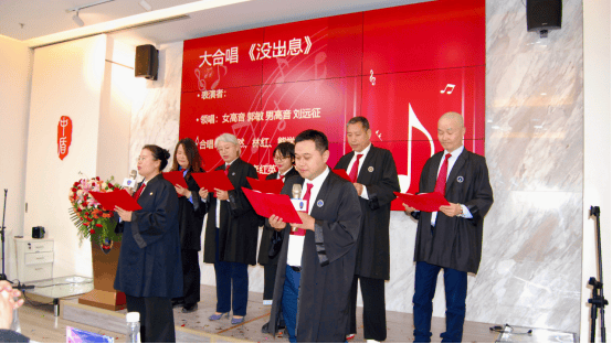 张主任演讲之后,《中盾之歌》的旋律悠扬响起,这首歌由刘远征律师领唱,九位律师共同合唱。这不仅是律所之歌,更是凝聚人心、彰显团队精神的战歌,唱出了中盾人的归属感与自豪感。