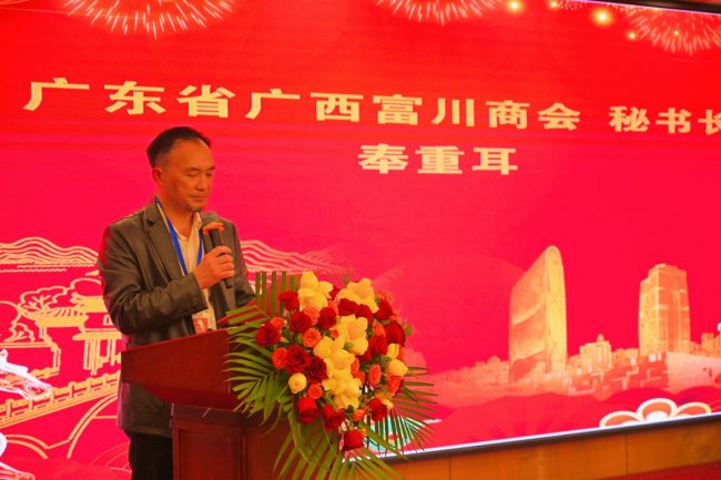 富川县人大常委会副主任、县工商联主席蒋贤栋在发言中用“娘家人”比喻商会对家乡的特殊情感。他充分肯定商会作为“粤桂桥梁”的贡献:“过去七年,商会不仅为在粤富川人撑起遮风挡雨的家,更为富川融入大湾区建设闯出了新路。”现场,他详细解读富川最新惠企政策,从税收优惠到用地保障,从人才引进到产业链配套,诚意十足的“政策礼包”引发企业家阵阵掌声。