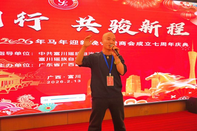 2026年2月13日,广东省广西富川商会在富川县美豪丽致酒店隆重举行2026马年迎新晚会暨商会成立七周年庆典。这是富川商会成立七年来,首次将年会主场设在家乡富川,县委统战部相关领导、县工商联负责人、兄弟商协会代表、企事业单位嘉宾及社会各界人士约200人齐聚一堂,共叙乡情、共谋发展。