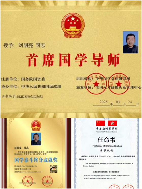 刘明亮老师跟随父亲不断地学习,钻研,现在刘老师以人生基因体系风水)(环境与健康)为主,取得了很高的成就,2024年荣获国学泰斗终身成就奖,2025年3月,特聘刘明亮老师为亚洲商学院国学教授一职,同时荣获首席国学导师。