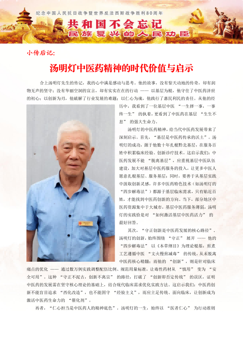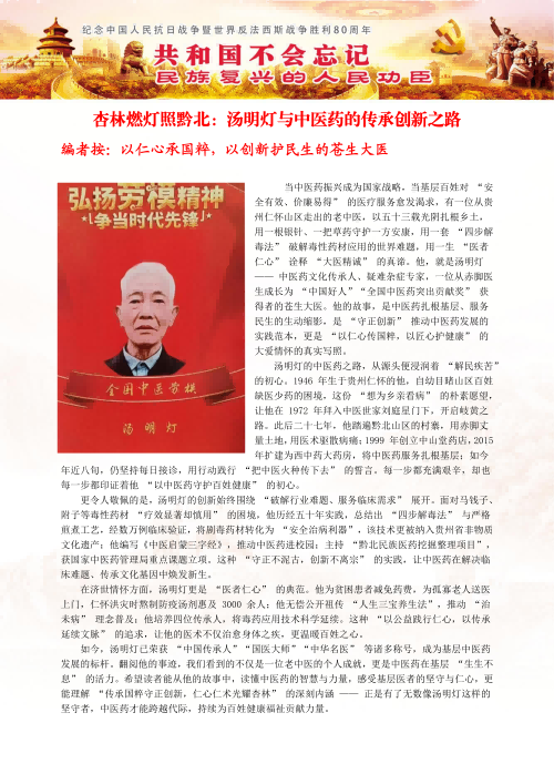 从赤脚医生到国医大师,中国中医传承人,全国各老中医汤明灯用一生诠释了“医者仁心"的深刻内涵。在他身上,我们看到了中医药文化生生不息的力量-既有《黄帝内经》的智慧传承,又有与时俱进的时代创新:既有悬壶济世的悲悯情怀,更有民族复兴的文化自信。正如《中医药理》扉页所题:"传承不泥古,创新不离宗。"这位大山里的苍生大医,正以其坚定的步伐,走出一条中医药振兴发展的康庄大道。