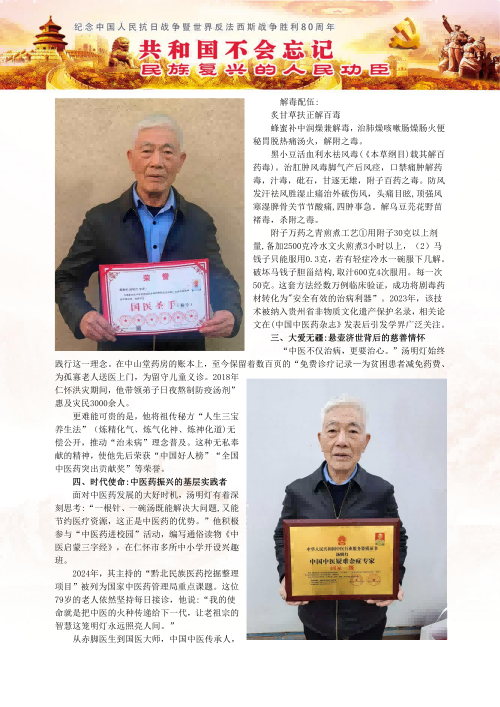 “中医不仅治病,更要治心。”汤明灯始终践行这一理念。在中山堂药房的账本上,至今保留着数百页的"免费诊疗记录—为贫困患者减免药费、为孤寡老人送医上门,为留守儿童义诊。2018年仁怀洪灾期间,他带领弟子日夜熬制防疫汤剂",惠及灾民3000余人。