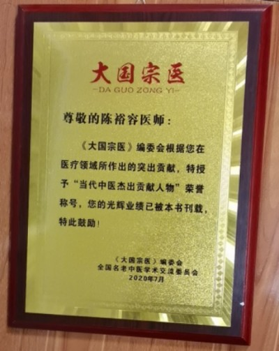 世界卫生组织传统醫学科学院首席终身院士、禅宗临济46代传人寂明印博医药大师丶全国中医劳模陈裕容博士。他潜心半生,立足临床,践行民族医药挖掘,传承中医药新药研发,以现代创新思维打开中华中医药文明宝库,孜孜不倦,默默奉献。他以独特的价值观、生命观、健康观、疾病观、防治观,助力于中华儿女强身健体;以科技创新,发掘中医药哲学内涵,推动中医药传承与时俱进;用新时代触角将创新与传统有机结合,取其精华去其糟粕、发明创造出多维健康产品。为擦亮祖国中医药文化名片,贡献着自己的力量。让中医药更好地为中国人的健康发挥其自然生态,标本兼治作奉献;为人类社会的健康发展作出更大的实质性的贡献!陈教授的世界观人生观高维博大。他道术相间仁心精诚,上医元首下医民众。他忧国忧民,胸怀祖国放眼世界,心装民族。在非典和新冠抗疫中贡献突出却从不证己。
