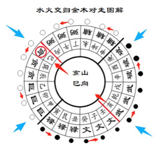 注:此诀乃四局放水之秘也,法在元空十字天心:“水火交归、金木对走”;如图,亥山巳向,乃亥巳交庚甲;(中针壬丙交庚甲;天盘巳亥交寅申;实为山盘庚甲与水盘亥巳山水之交也)天心十字立极,元运零正可识,阴阳两片可辨。