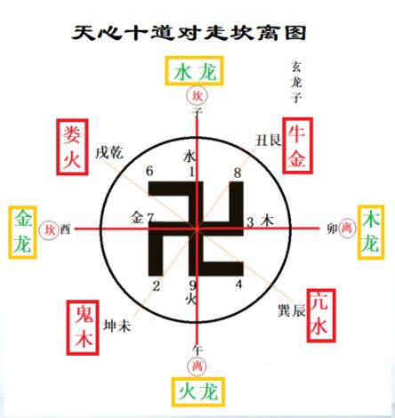人们常把东西、南北四个字,理解为方位。即寅甲卯乙辰巽巳丙八个字,列为八神居东。申庚酉辛戌乾亥壬八个字,列为八神居西。又以午丁未坤,子癸丑艮八个字,称这南北八神。至于四个一,四个二,隐而带过。江者,水也、界也。江东、江西,实指来去之水。南、北,则指坐与向。三合之法,并不仅以固定的方位来论八神。古人以四兽来论方位,即北玄武,南朱雀,东青龙,西白虎。并以此四兽论龙穴,无论何坐、何向,均是左青龙,右白虎,前朱雀,后玄武、之“天心十道”证之(见上图);水法虽有千条万绪,统归“四金”以收之;皆依水口裁四局。正是:“五行实无系于龙家,祸福须取明于水路”者也。