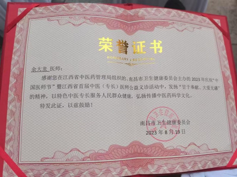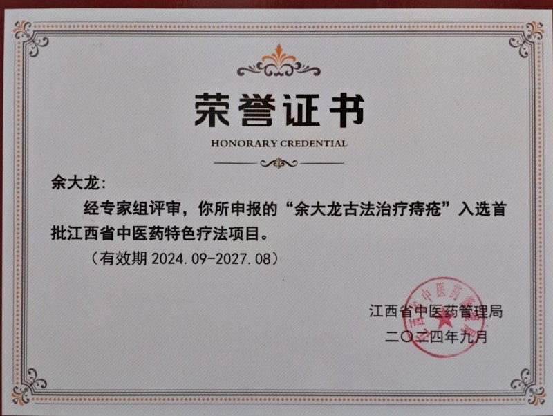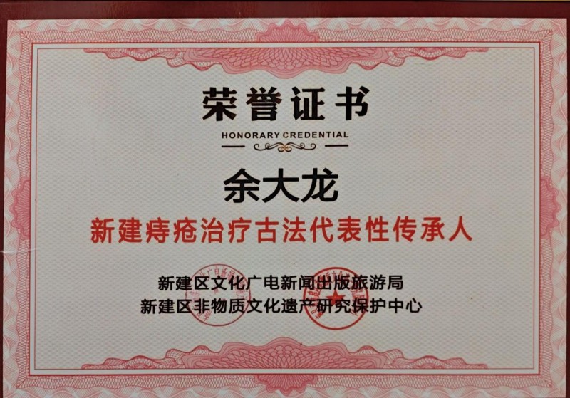 从军营医者到地方名医,他始终坚守 “医者为民” 的初心。家族第三代传承人余兆成老先生深耕肛肠 60 年,提炼优化祖传秘方,研制出无色无味、专属秘制的中药配方,非市面通用硬化剂,安全无副作用。余大龙接过传承接力棒,守正创新,让百年古法在新时代焕发新生,2023 年 “痔疮治疗古法” 列入新建区非物质文化遗产,2024 年入选江西省首批中医药特色疗法项目。