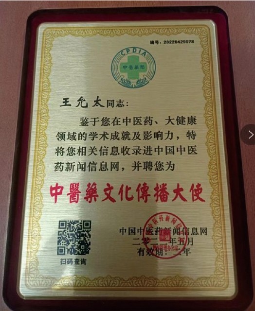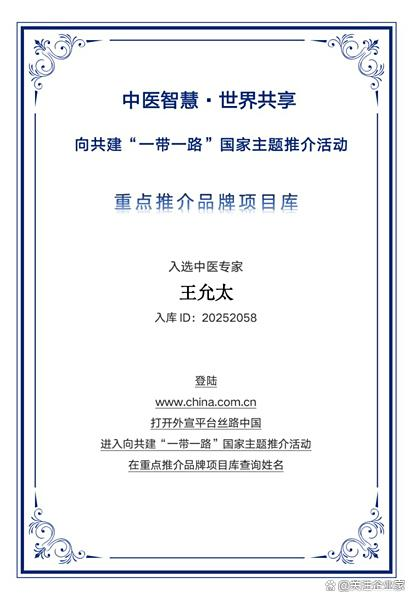 作为中医传承与创新的代表人物,王允太积极推动中医走向更广阔舞台。他的事迹入选 “一带一路” 国家主题文化健康品牌推荐项目,成为中医文化对外传播的重要名片。他始终秉持 “人民健康为本” 的信念,愿做健康守护的灯塔,让更多人了解、受益于中医。